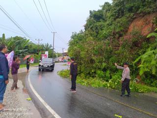 Bersama Masyarakat, Polsek Kuantan Mudik Bahu Membahu Bersihkan Kayu Tumbang Disebabkan Tanah Longsor Yang Mengenai Bahu Jalan Lintas Lubuk Jambi Telu