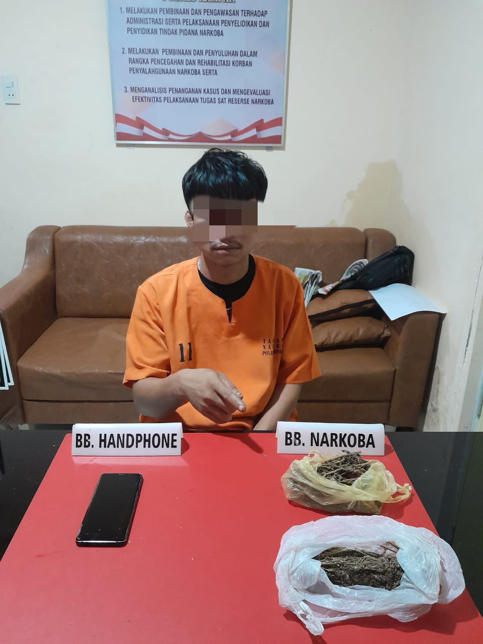 Ditambah Kasat, awal penangkapan saat Tim menangkap YU yang mengakui mendapatkan Narkotika jenis tanaman Daun Ganja Kering tersebut dari pelaku PU.