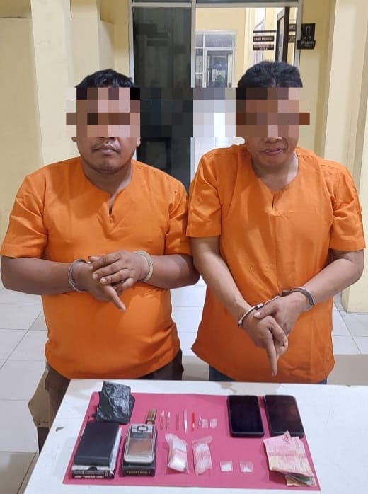 Bersama pelaku berhasil diamankan 2 paket yang diduga narkotika jenis Shabu yang dibungkus plastik bening, 2 ball plastik bening, 2 unit timbangan digital warna hitam dan silver, 2 buah sendok shabu yang terbuat dari pipet plastikn uang tunai Rp 575.000,- dan 2 unit Handphone warna silver dan hitam.