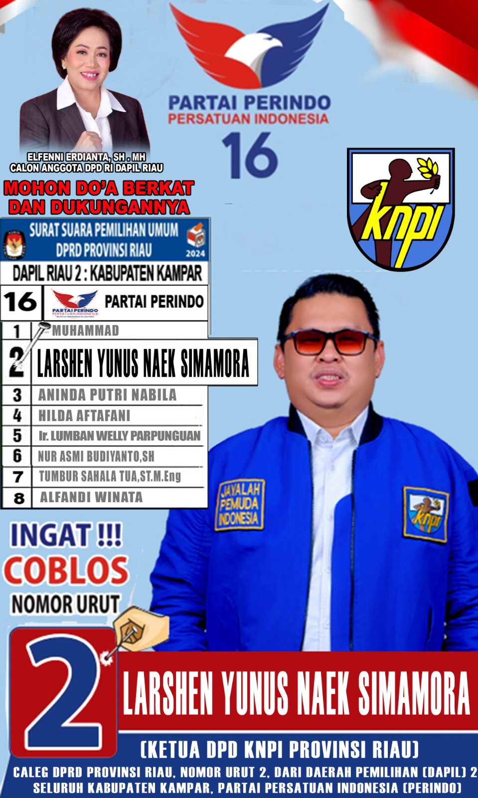 "Ayo bapak ibu Masyarakat Riau, khususnya yang tinggal di Daerah Kabupaten Kampar. Saatnya kita semua memberikan Hak Suara dan Mandat kepada sosok yang tepat. Siapapun Presiden-Wakil Presidennya, Anggota DPRD Provinsi Riaunya adalah Larshen Yunus Naek Simamora, Nomor Urut 2 dari Partai Persatuan Indonesia (PERINDO-16). Mari kita pilih Sosok yang Mengerti dan Faham akan tugas-tugas Wakil Rakyat. Jangan salah memilih hanya karena uang yang tak seberapa. Prinsipnya adalah kita semua harus Cerdas. Walaupun Juga ada Plus-Minusnya, namun!! Larshen Yunus Naek Simamora wajib di Menangkan, di Jadikan sebagai Anggota DPRD Provinsi Riau, periode: 2024-2029. Bersatu, Berjuang dan Menang. Pilihlah sosok yang tepat, agar dapat Menghadirkan Berkat" akhir Fatimah Zendrato S.Pd, salah seorang Guru di Kecamatan Tapung, Kabupaten Kampar. (*)