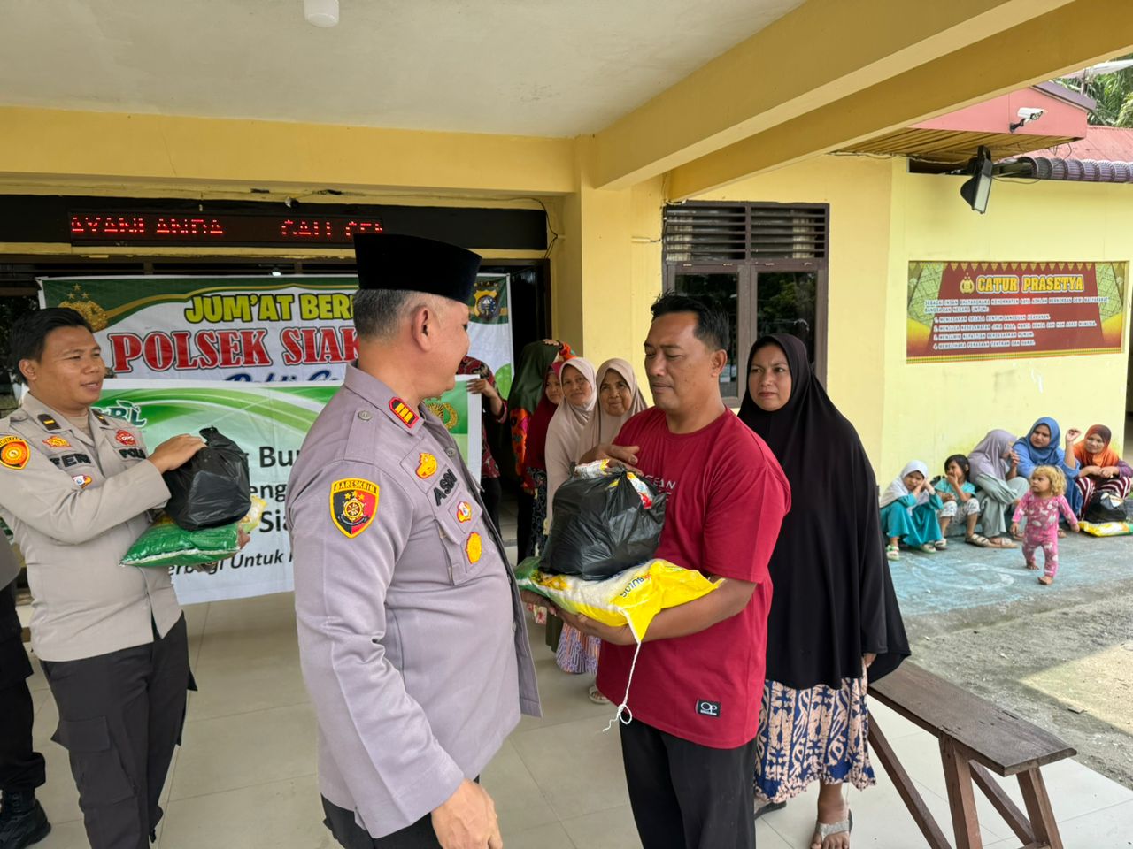 Kampar, Kegiatan Rutin Bantuan Sosial dalam giat Jumat Curhat dan Berkah kali ini dengan tema" Polri Presisi Mendukung Percepatan Transformasi Ekonomi Yang Inklusif dan Berkelanjutan Menuju Indonesia Emas". Kapolsek Siak Hulu AKP Asdisyah Mursyid, S.H di dampingi Waka Polsek AKP Yulius serta Jajaran Anggota bersama PT. Agung Bumi Lestari (ABL) yang dipimpin Sdr. M. Syarif Hidayatullah, S.H berkesempatan berbagi 20 Paket Sembako kepada warga kurang mampu. Jumat (12/7/2024)