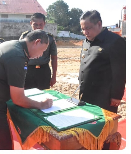 Pekanbaru- Komandan Korem 031/Wira Bima Brigjen TNI Dany Rakca, S.A.P., M. HAN., bersama Pj gubri  menggelar peletakan batu pertama sebagai pertanda dimulainya pembangunan rumah sakit tentara yang menggunakan APBD Riau tahun 2024, Kamis (18/7/24)