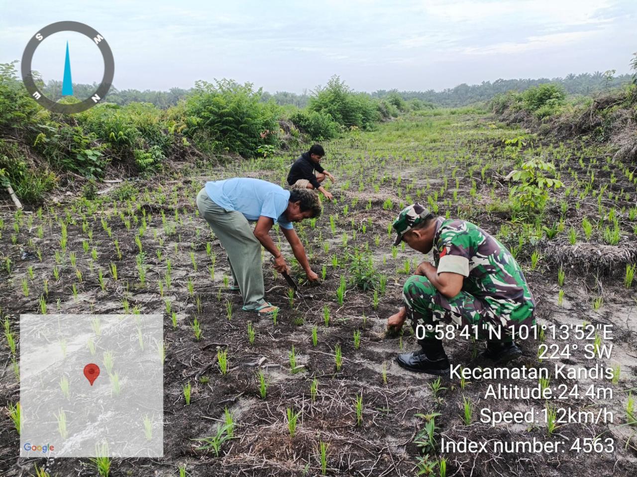 Dengan koordinat 0°58'47"N, 101°13'51"E, lahan pertanian ini menjadi pusat perhatian dalam upaya menjaga kualitas tanaman. Usia tanaman padi saat ini mencapai 26 hari, dan perawatan difokuskan pada pembersihan gulma serta rumput liar yang dapat mengganggu pertumbuhan padi. Serka Budi Santoso dan Koptu I Ketut Budiasa bersama petani melakukan pembersihan dengan mencangkul dan mencabut gulma secara manual, memastikan tanaman padi tetap tumbuh dengan sehat.