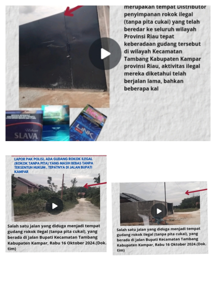 Menindaklanjuti informasi tersebut tim awak media ini akan mengkonfirmasi oleh pihak terkait APH Aparat Penegak Hukum kepolisian Wilayah hukum setempat Mapolsek Tambang Polres Kampar Polda Riau serta Pihak Bea Cukai kuat dugaan adanya aktivitas gudang rokok ilegal di jalan Bupati Desa Tarai Bangun Kecamatan Tambang Kabupaten Kampar dengan menyertakan foto serta dokumentasi untuk segera dapat ditindaklanjuti sesuai ketentuan hukum perundangan yang mengatur tentang peredaran rokok tanpa pita cukai karena telah rugikan negara miliaran rupiah.