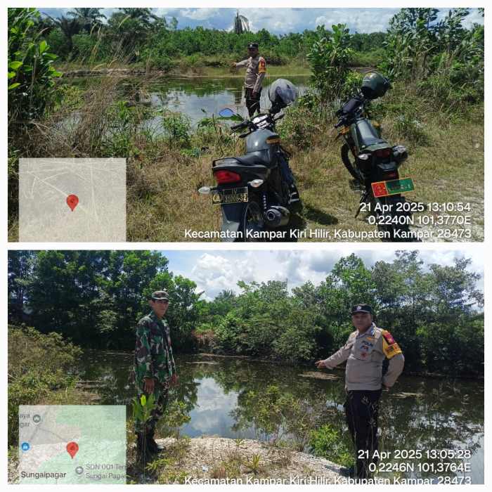 Kampar Kiri Hilir, - Bhabinkamtibmas Kelurahan Sungai Pagar, Bripka Zamroni Daulay, bersama Danpos Ramil Kecamatan Kampar Kiri Hilir, Peltu Rudi M. Tanjung,  terus berupaya  mencegah  terjadinya  kebakaran  hutan  dan  lahan  (karhutla)  di  wilayahnya.  Pada  Senin  (20/04/2025)  sekira  pukul  13.00  WIB,  Bripka  Zamroni  melakukan  pengecekan  embung  di  dua  lokasi  di  Kelurahan  Sungai  Pagar  serta  menjalin  sambang  dengan  warga  dan  mensosialisasikan  tentang  larangan  membakar  hutan  dan  lahan.