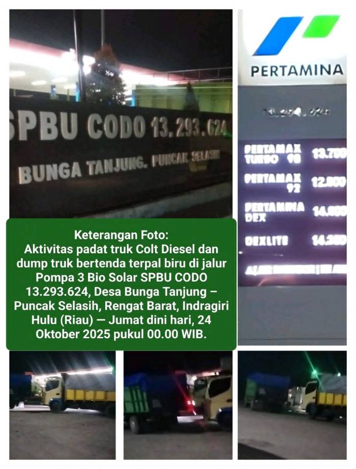Tepat Jumat dini hari, 24 Oktober 2025 sekitar pukul 00.00 WIB, situasi di SPBU CODO 13.293.624 yang berlokasi di Jalan Lintas Timur, Desa Bunga Tanjung – Puncak Selasih, Kecamatan Rengat Barat, Kabupaten Indragiri Hulu (Inhu), Riau, kembali mencoreng wajah penegakan hukum dan integritas pengawasan distribusi BBM bersubsidi jenis Bio Solar.