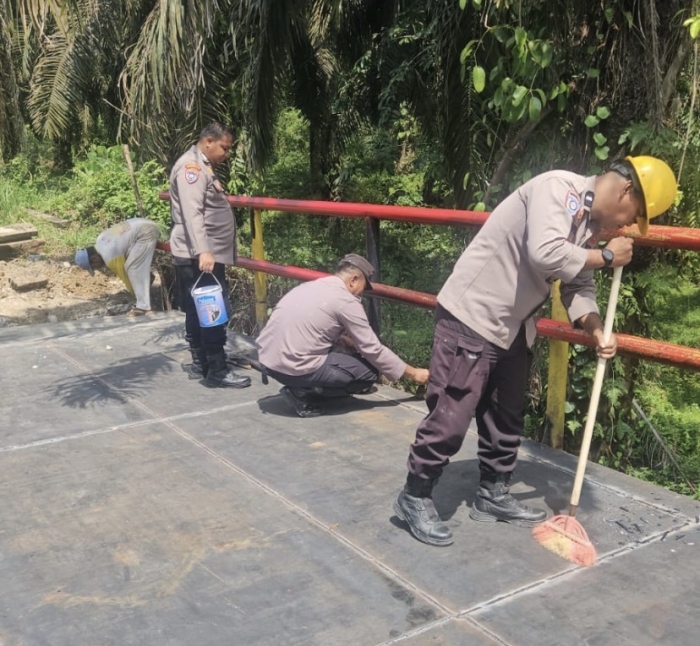 Kapolsek Bangkinang Barat IPTU Rully Chairullah, S.E, M.Si, M.O.S, bersama Bhabinkamtibmas dan personel Polsek Bangkinang Barat melakukan pemantauan langsung terhadap proses pekerjaan yang berjalan sesuai jadwal tanpa kendala. Target selanjutnya meliputi pemasangan, pemotongan, pengelasan, dan pengecatan lantai besi pelat bunga, serta pengecatan pagar dan pengecoran lonjing jembatan.